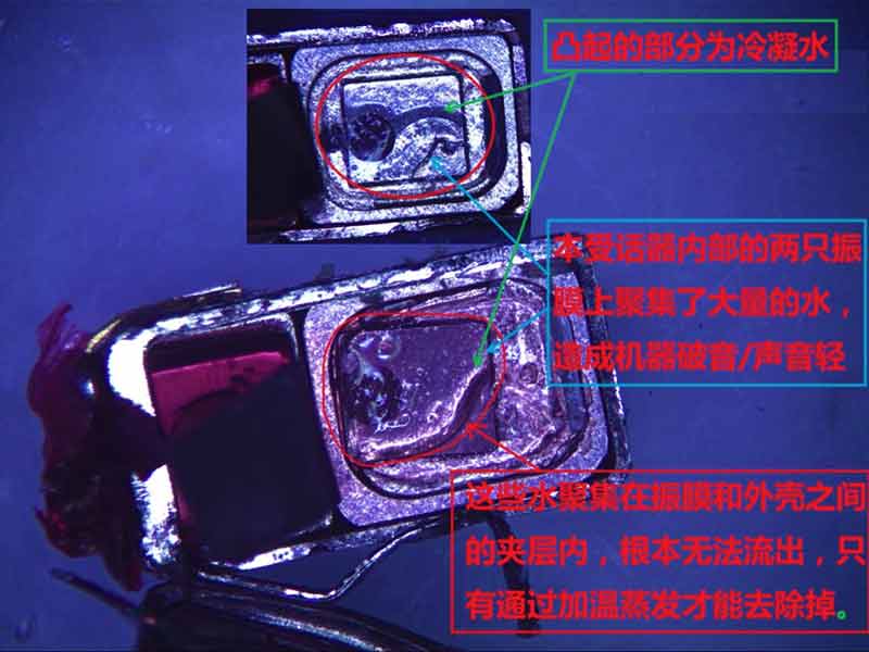助听器内的冷凝水因为不易注意,等到助听器出现故障才处理时可能已经太晚了,助听器已经受潮损坏了。有的助听器内部的冷凝水可以从外部处理,但有的助听器冷凝水只有通过加热才能蒸发掉。下图是一台耳内式助听器受话器拆开的照片,可以看到凸起的冷凝水位于两片授话器振膜之间的夹层内, 不靠加热是蒸发不出来的。