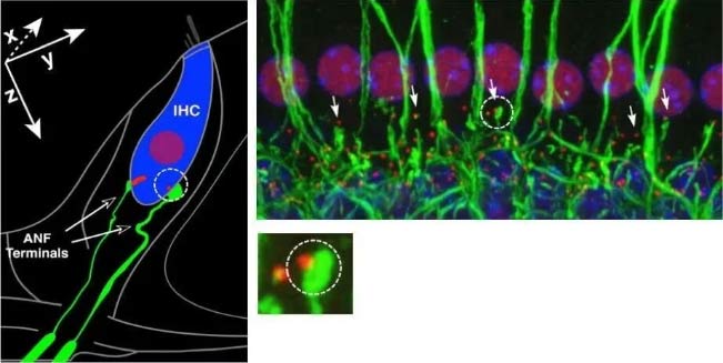 耳蜗内的突触损害,特指内毛细胞与听神经纤维之间的“带状突触” 的损伤。突发性耳聋完全可能导致,甚至可以说其核心损伤之一就是突触损伤。近年来对于“隐匿性听力下降”和“耳蜗突触病(Cochlear Synaptopathy)”的研究为我们提供了更深的理解。即便一些内毛细胞在突聋后幸存下来,它们与听神经末梢之间的连接器—突触,也可能被大量破坏。大量的神经连接永久性断裂,会导致大脑接收到的声音信号质量严重下降,这时虽然能够产生声音信号,但在传递给听神经的第一站就出现了“丢包”和“时序错乱”。让患者感觉耳朵“发闷”、“听声音失真”、“在嘈杂环境中听不清别人说话”,这正是突触损伤的典型后遗症。