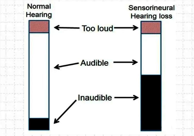 正常人耳能听到的声音频率范围大约是0到120分贝,从悄悄话到飞机引擎都可以轻松拾取。但突聋后的听力动态范围会急剧变窄,导致出现“小声听不见,大声又嫌吵”的现象,也被称为"响度重振"(Recruitment)。所以助听器放大变得极其敏感。稍微放大一点,患者感觉听不见。再放大一点,声音又变得无法忍受,也导致了患者对于助听器的厌恶!