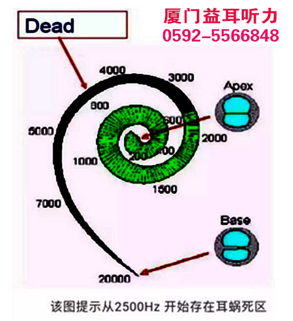 当某一频率区域的内毛细胞几乎完全丧失功能时,这个区域就被称为“耳蜗死区(Cochlear Dead Regions)”。当声音的频率落入“死区”,大脑将无法接收到任何有效信息,无论助听器把这个频率的声音放得再大,也没有任何效果。更糟糕的是,这种巨大的能量还会泄露到邻近尚有功能的频率区域,产生严重的失真感和噪声感,干扰对其他频率声音的感知。
