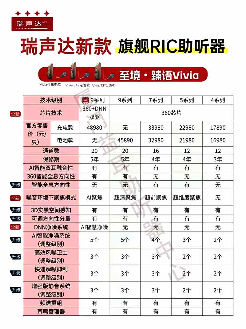 瑞声达至境·臻语Vivia人工智能AI助听器各系列功能对比: